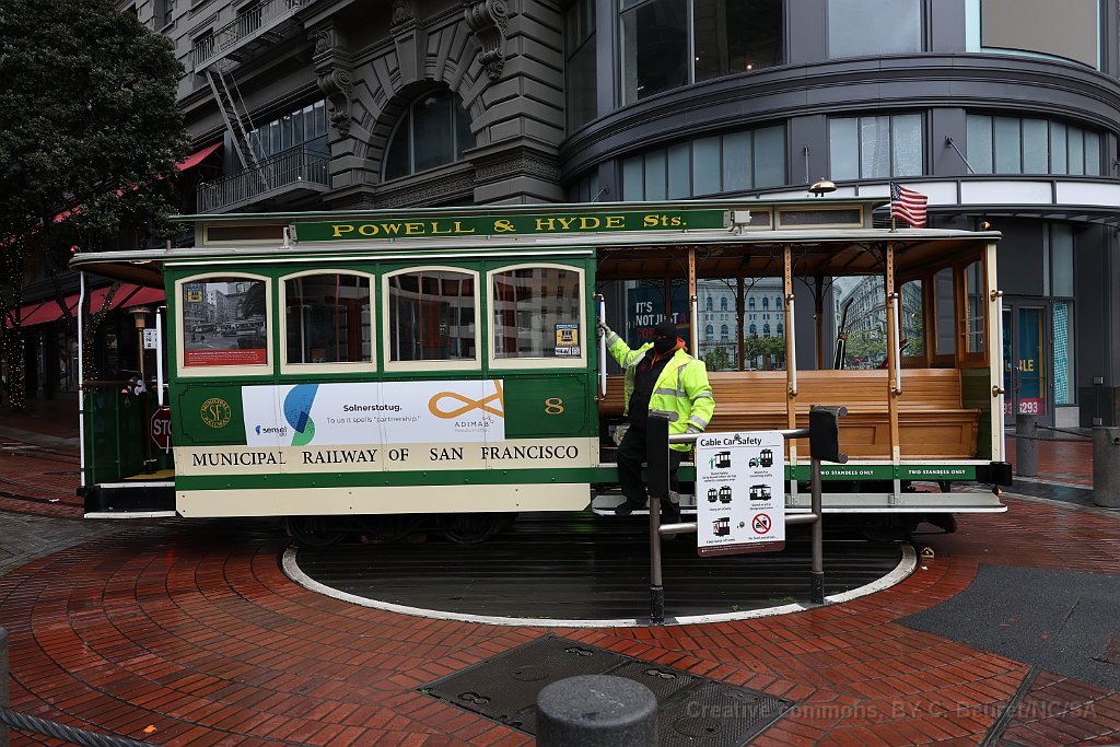 17 Cablecar de California Street. Sur cette ligne il n'y a pas de plaque tournante, les cable car circulent dans les deux sens (on notera aussi la différence avec ceux des autres lignes dans la disposition.
