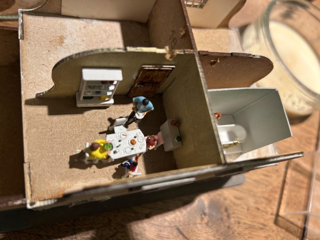 A l’étage supérieur, il y a d’une part une salle à manger avec une famille à table et de l’autre côté, la femme du chef de gare dans sa salle de bain…