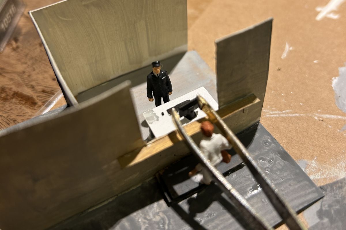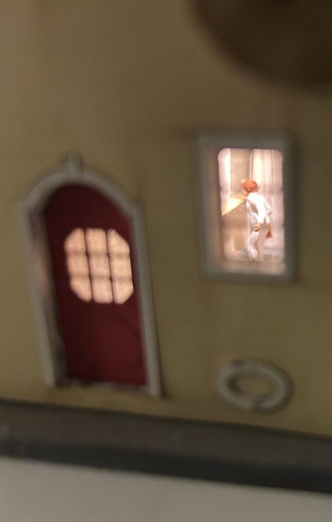 J’ai décidé de mettre un peu de vie dans le bâtiment en y ajoutant quelques saynètes et un éclairage. Voici quelques images de la gare en construction avec ces détails: