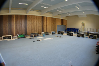 Les choses sérieuses commencent le samedi matin avec l’alignement des segments par terre (photo à comparer avec celle de la dernière fois: qu’est-ce qui est venu se rajouter?) qui laisse Eric et Francis perplexes: