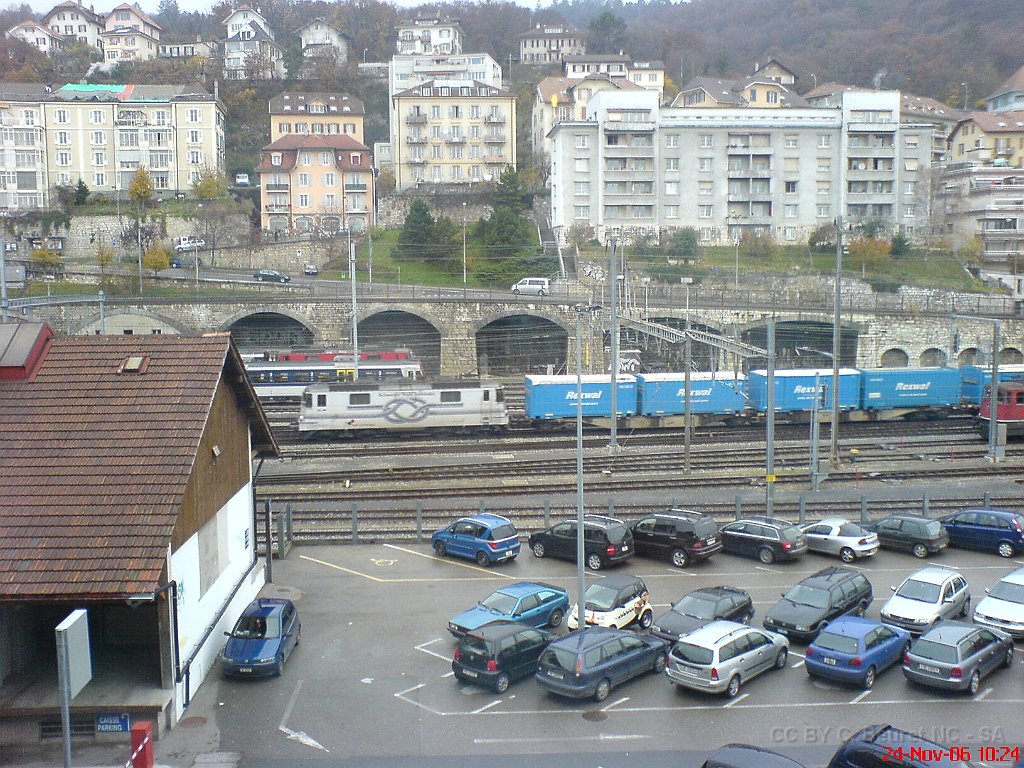 1 Re 436 Crossrail avec containeurs. Train de copeaux de bois, le "Bostryche". Neuchâtel